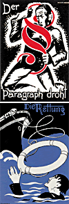 Más ejemplos de folletos publicitarios e informativos de los años treinta: ponen de manifiesto los peligros que pueden amenazar al particular y al hombre de negocios por reclamaciones de responsabilidad civil. Los parágrafos legales son representados como monstruos estranguladores, mientras el seguro se adorna con el símbolo del salvavidas.